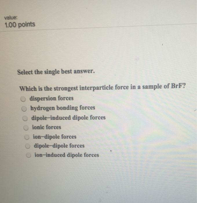 Since the electrons in an atom or molecule may be unevenly distributed at any one instant, dispersion forces are present in. What is the strongest interparticle force in a sample of kr andin a sample of sbh3? What is the strongest interparticle force in a sample of kr? Solution for what is the strongest interparticle force in each substance?(a) kr(b) brf(c) h₂so₄ 80% (15 ratings) 1) what is the strongest interparticle force in a sample of kr is london dispersion force. It is nobel gas. View the full answer. Select the single best answer. What is the strongest interparticle force in a sample of kr?